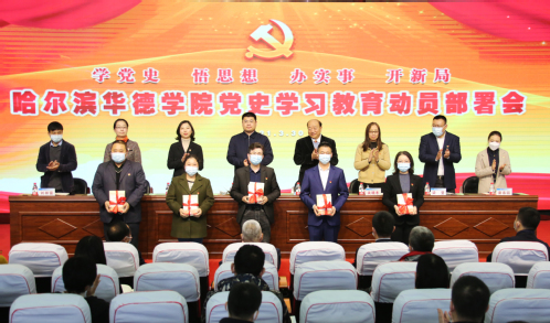 党委书记王春雷在动员讲话中深刻阐述了开展党史学习教育的重大意义,明确提出了党史学习教育的目标任务和工作要求,并对开展好党史学习教育提出四点意见。一是统一思想认识,深刻领会党史学习教育的重大意义。要深刻认识开展党史学习教育,是牢记初心使命、推进中华民族伟大复兴历史伟业的必然要求;是坚定信仰信念、在新时代坚持和发展中国特色社会主义的必然要求;是推进党的自我革命、永葆党的生机活力的必然要求,同时也是落实立德树人根本任务的必修课程,建设高质量教育体系的必修课程,提高党建质量的必修课程。二是把握核心要义,准确理解党史学习教育的目标要求。坚持学习党史与学习新中国史、改革开放史、社会主义发展史相贯通,做到学史明理、学史增信、学史崇德、学史力行,引导广大党员干部增强“四个意识”、坚定“四个自信”、做到“两个维护”,不断提高政治判断力、政治领悟力、政治执行力。在学习教育中聚焦“学党史”,传承红色基因;聚焦“悟思想”,强化理论武装;聚焦“办实事”,服务人民群众;聚焦“开新局”,服务“十四五”起好步。与此同时,要深入学习“龙江四大精神”和华德学院办学实践探索历史,了解我们党的光荣传统、宝贵经验和伟大成就,了解学校紧跟改革开放大潮,艰难跋涉、艰辛探索、艰苦创业的奋斗历程。继承革命传统、传承红色基因、补足精神之钙。三是抓住重点环节,严格落实党史学习教育的具体安排。要坚持“三个贯穿始终”,即将学深悟透习近平新时代中国特色社会主义思想贯穿始终,将学史明理、学史增信、学史崇德、学史力行目标要求贯穿始终,将学党史、悟思想、办实事、开新局贯穿始终。要坚持“两融入一融合”,把党史学习教育融入教育教学、融入校园文化建设,融合“四史”学习,聚力为民服务。聚焦与中心工作相贯通,与思政工作相贯通,确保党史学习教育有力度、有深度。四是强化政治担当,确保党史学习教育的质量效果。要注重实际效果,强化结果导向,把党史学习教育与庆祝建党100周年和建校29周年结合起来,与学习贯彻习近平新时代中国特色社会主义思想结合起来,与巩固深化“不忘初心、牢记使命”主题教育成果结合起来,与推进“三全育人”、提升立德树人质量结合起来,与统筹疫情防控和谋划“十四五”改革发展结合起来,着力解决实际问题、健全完善长效机制。