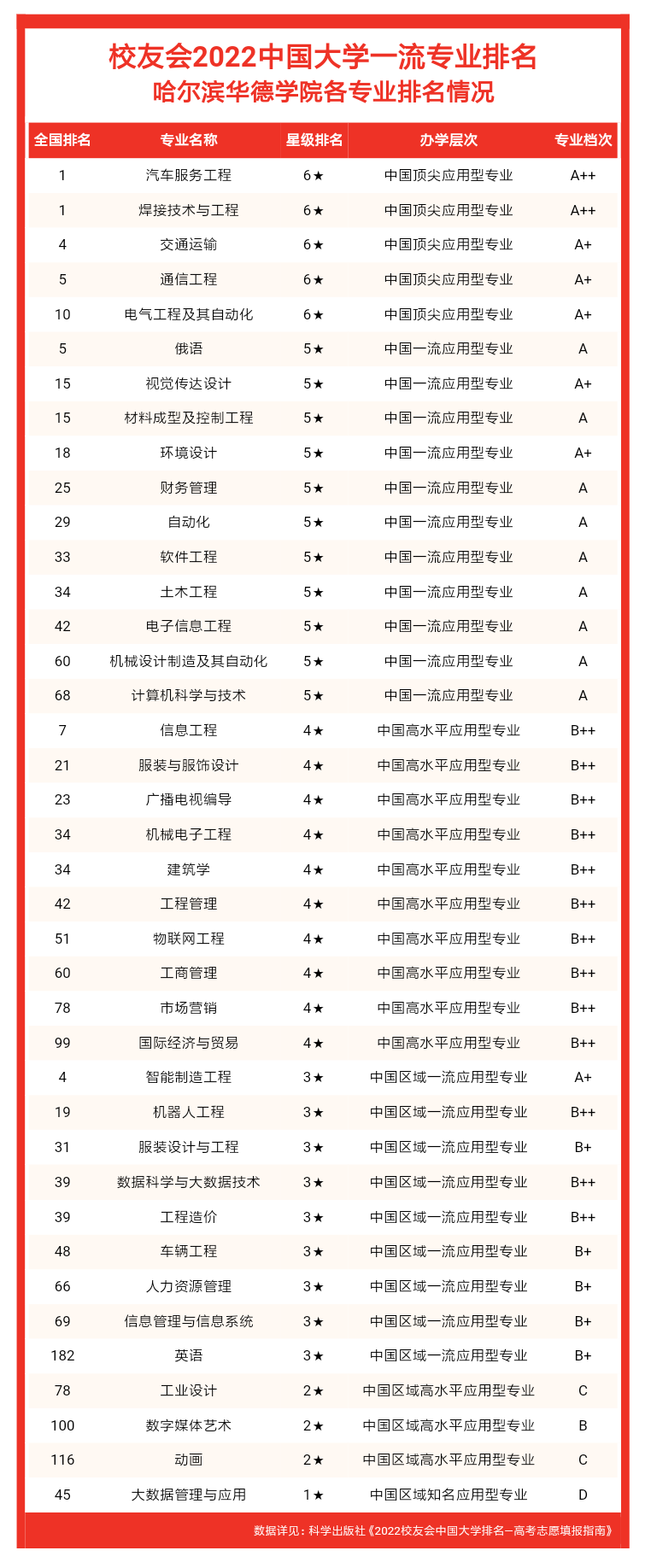 全国第三方大学评价机构艾瑞深校友会网最新发布校友会2022中国大学各专业类一流专业排名。榜单显示,在中国大学一流专业排名(应用型)中,哈尔滨华德学院焊接技术与工程、汽车服务工程、交通运输、通信工程、电气工程及其自动化等专业荣膺2022中国六星级应用型专业,被评为中国顶尖应用型专业。榜单显示,在最新校友会2022中国大学一流专业排名(应用型)中,哈尔滨华德学院有5个中国六星级专业(6★),11个中国五星级专业(5★),10个中国四星级专业(4★),9个中国三星级专业(3★)。