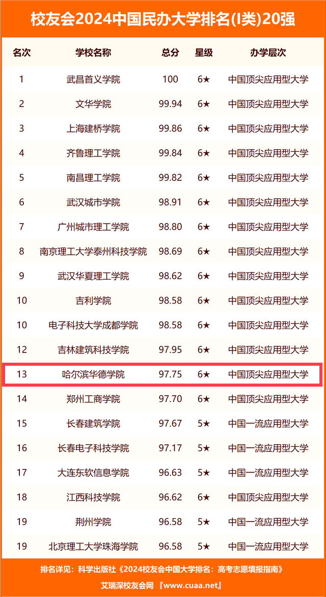 2024年1月16日,备受瞩目的校友会2024中国大学排名正式发布。哈尔滨华德学院凭借卓越的办学实力和影响力,位列2024中国民办大学排名(I类)第13名,省内同类院校工科类排名第一。这是哈尔滨华德学院继2023年排名17位再次取得的喜人成绩,标志着学校综合办学实力再上新台阶。目前,哈尔滨华德学院已连续四年入围“校友会中国民办大学排名20强”(I类)。