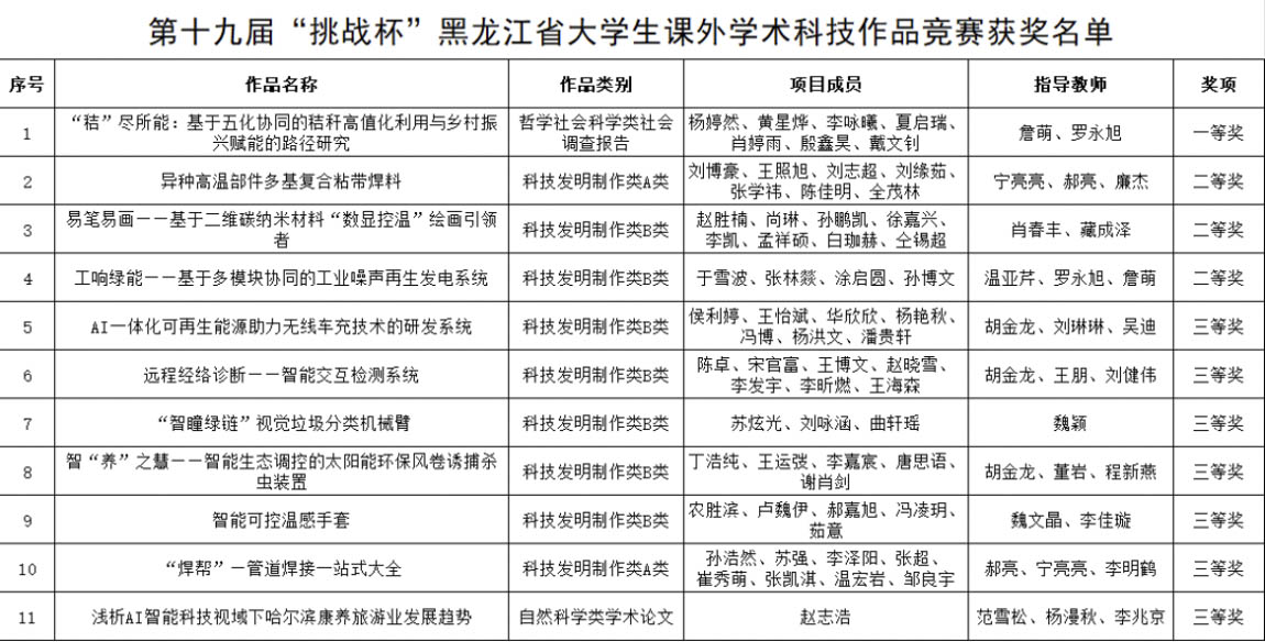 近日,团省委、省教育厅、省科技厅、省社科院、省科协、省学联联合发布《关于表彰第十九届工银融e行“挑战杯”黑龙江省大学生课外学术科技作品竞赛获奖集体和个人的决定》。哈尔滨华德学院学子凭借卓越的创新能力和扎实的专业素养,在全省众多高校参赛团队中脱颖而出,共荣获一等奖1项、二等奖3项、三等奖7项,获奖数量创历史新高,充分展现了学校在创新创业教育方面的显著成效和学子锐意进取的精神风貌。