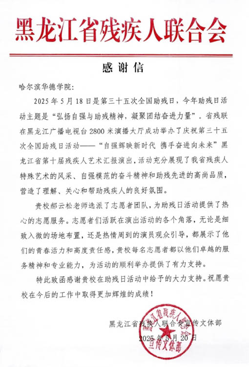 △ 全国助残日,哈尔滨华德学院组织志愿者圆满完成了黑龙江省第十届残疾人艺术汇报演出的多项服务工作,获得省残联的高度赞扬