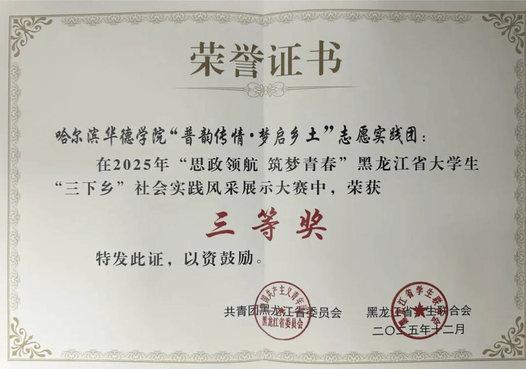 2025年12月4日,2025年“思政领航 筑梦青春”黑龙江省大学生“三下乡”社会实践风采展示大赛获奖结果公布,哈尔滨华德学院“普韵传情·梦启乡土”志愿实践团凭借其在四川省凉山彝族自治州等地扎实开展的推普助力乡村振兴志愿服务实践荣获三等奖,同类院校仅三所高校获奖。实践团深入乡土,用语言搭建桥梁,以文化浸润心田,为服务乡村发展贡献了华德学子的智慧与力量,彰显了学校思想政治教育工作与社会实践深度融合的育人实效。