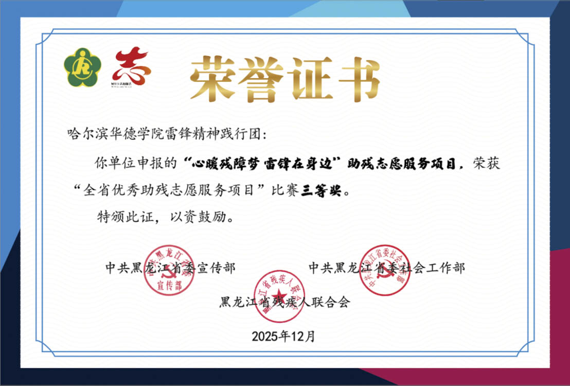 近日,由黑龙江省委宣传部、省委社会工作部、省残联联合组织的“全省优秀助残志愿服务项目”征集活动结果揭晓。经过项目展示、专家评审、媒体公示等多轮激烈角逐,哈尔滨华德学院雷锋精神践行团的“心暖残障梦、雷锋在身边”助残志愿服务项目,以其精准的立意、扎实的组织和广泛的社会影响荣获三等奖。