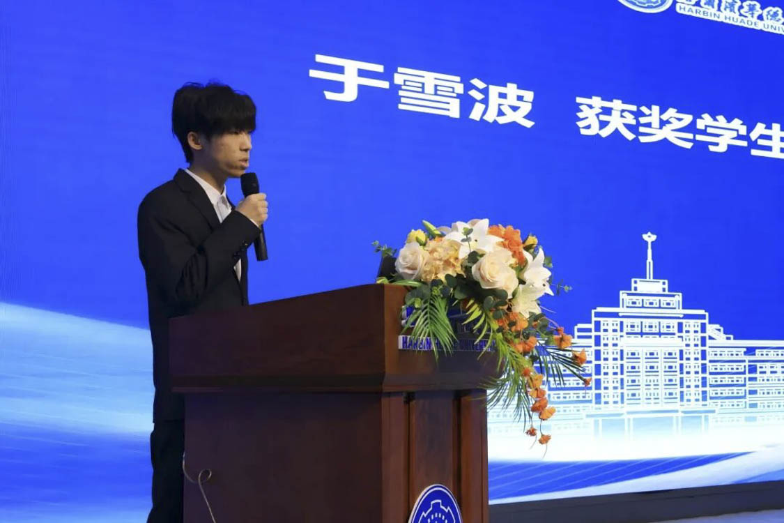 哈尔滨华德学院副校长张艳发表讲话,对学校在2025年大赛中取得的成绩给予充分肯定,向所有获奖学生、指导教师及付出努力的相关单位和个人表示感谢。讲话中,校领导回顾了学校在创新创业教育方面的积累与成效,表示本届大赛成绩的取得,离不开获奖项目团队向下扎根、学校系统赋能、指导老师共同奋斗;并对2026年大赛备赛工作提出明确要求,希望全体师生能够做到以此次大会为契机,传承创新精神,凝聚奋进力量,力争在后续赛事中再创佳绩。