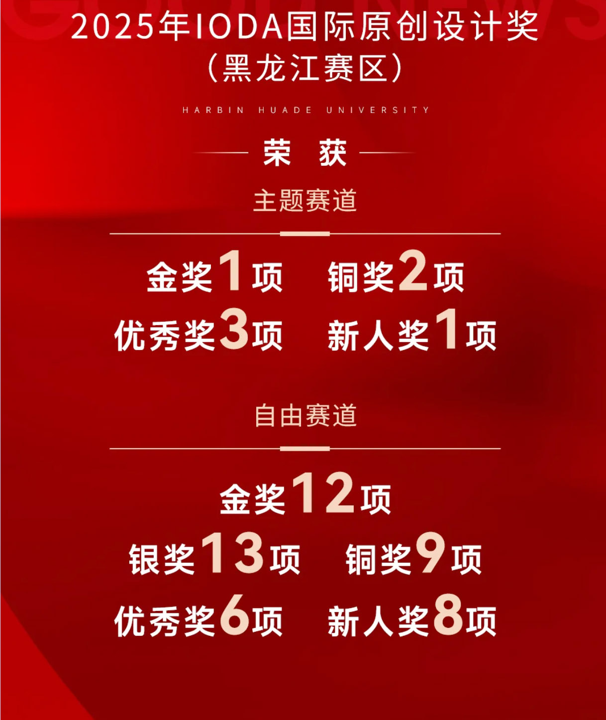近日,2025年IODA国际原创设计奖(黑龙江赛区)获奖名单公布, 哈尔滨华德学院艺术与传媒学院师生在此次大赛中表现卓越,共有55个项目获奖,获奖总数与高等级奖项数量均位居省内高校前列,充分展现了学校在设计创新与非遗产教融合领域的深厚实力。 艺术与传媒学院名誉院长、设计学科带头人、泰国西那瓦大学博士生导师张红松教授担任IODA国际原创设计学术顾问,7位华德教师受聘担任省赛评委会、国赛委员会评委,彰显学校在区域设计教育领域的学术引领力与专业话语权。
