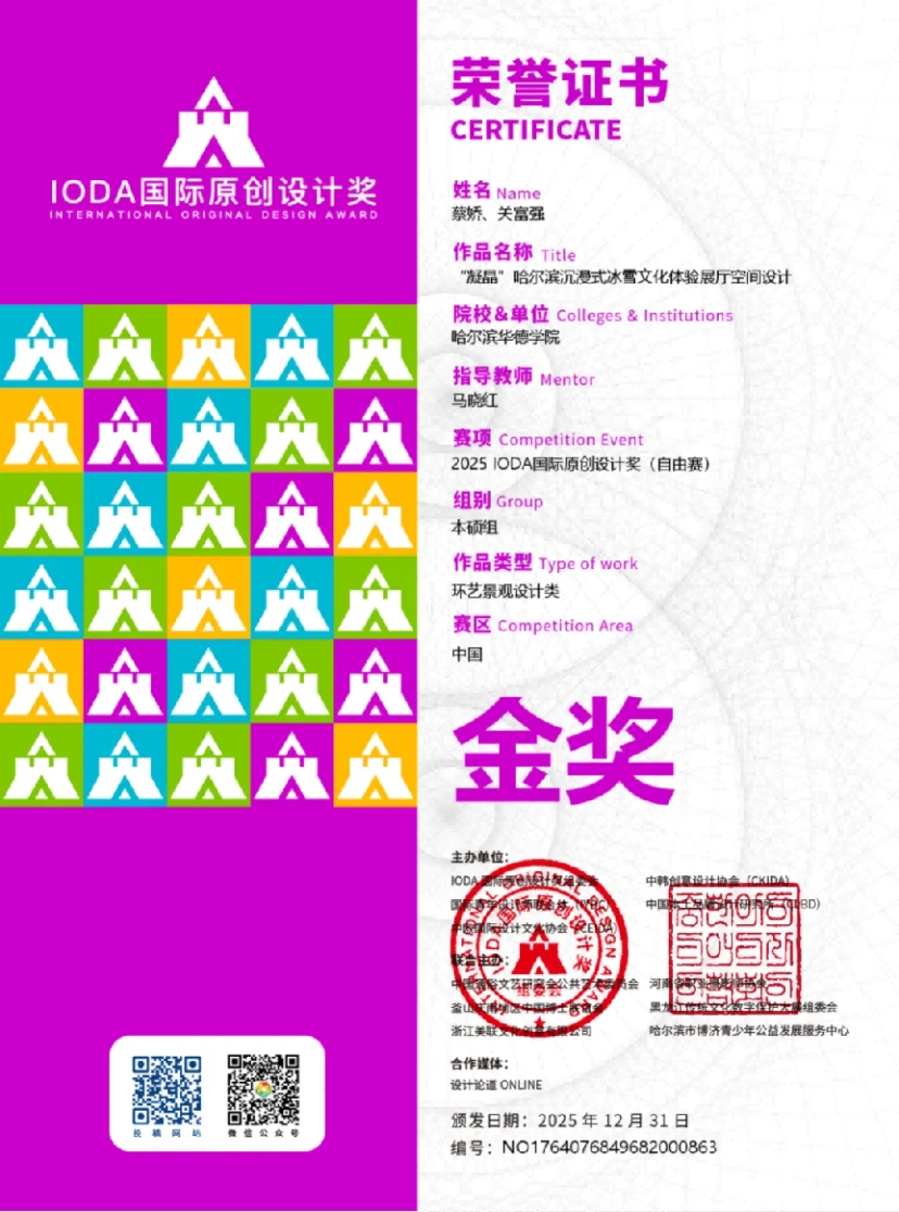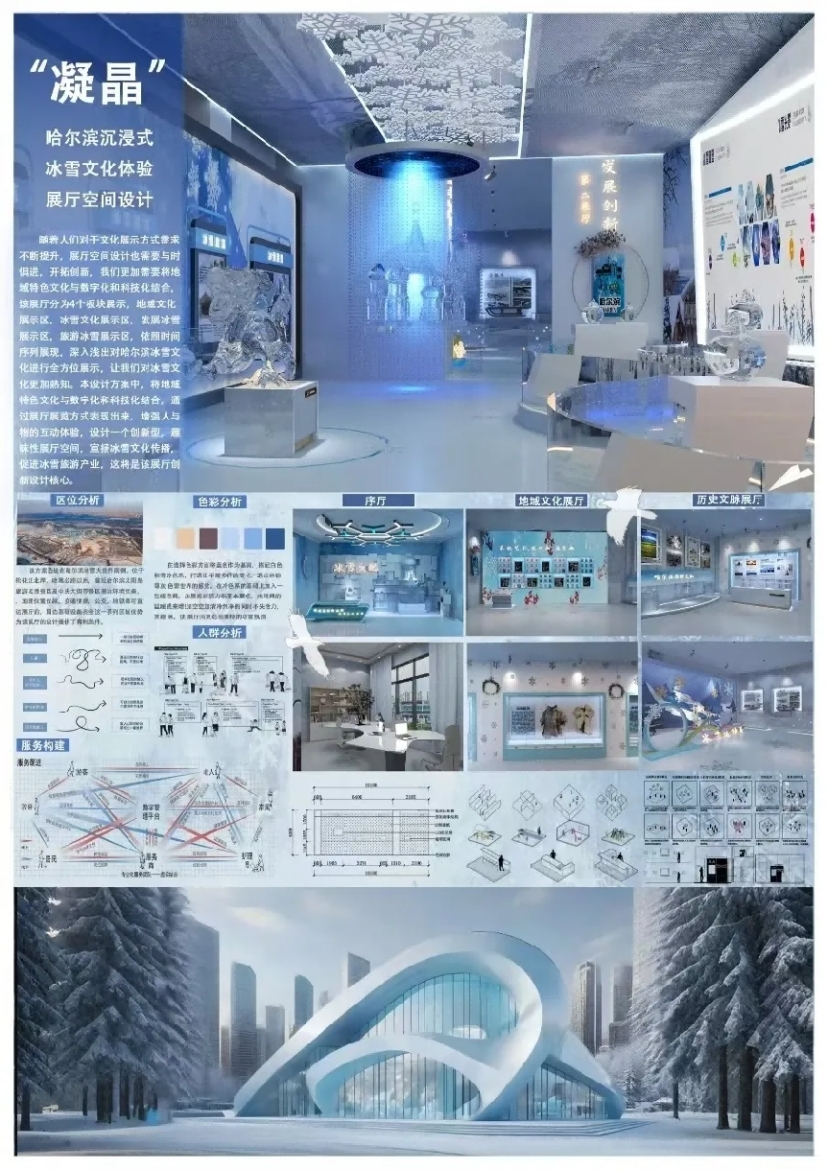 获奖学生代表蔡娇、关富强:“我们的作品《“凝晶”哈尔滨沉浸式冰雪文化体验展厅空间设计》是本次大赛环艺景观类金奖作品之一,哈尔滨的冰雪,对我而言不仅是自然馈赠,更是承载城市精神的文化。我们想构建一个能够让人‘走进冰雪记忆’的场域。 ‘凝晶’的创作初衷,是希望用当代设计语言,重构冰雪的形态与温度,让每一位走入展厅的人,都能感受到这座城市独有的浪漫与坚韧。 ”