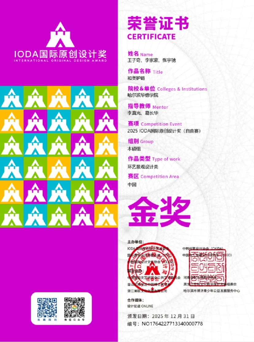 近日,2025 IODA国际原创设计奖国赛评审结果正式揭晓。 哈尔滨华德学院艺术与传媒学院师生共荣获国家级奖项40项,涵盖金奖6项、银奖13项、铜奖15项及优秀奖、新人 奖多项, 在自由赛与主题赛等多个赛道均取得突破性成绩。 这一丰硕成果,充分彰显了学校在设计教育领域的深厚积累、创新活力与国际视野。
