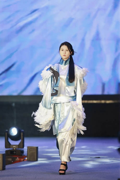 服装系列“消逝”与“璇花”从冰雪文化中汲取灵感,古老的诗句在创新设计中焕发新生,仿佛一段流动的冬日诗篇于T台上缓缓展开。