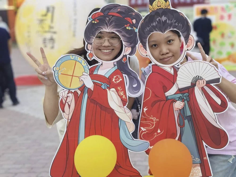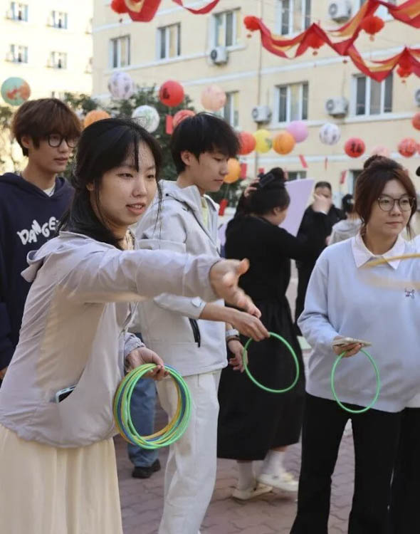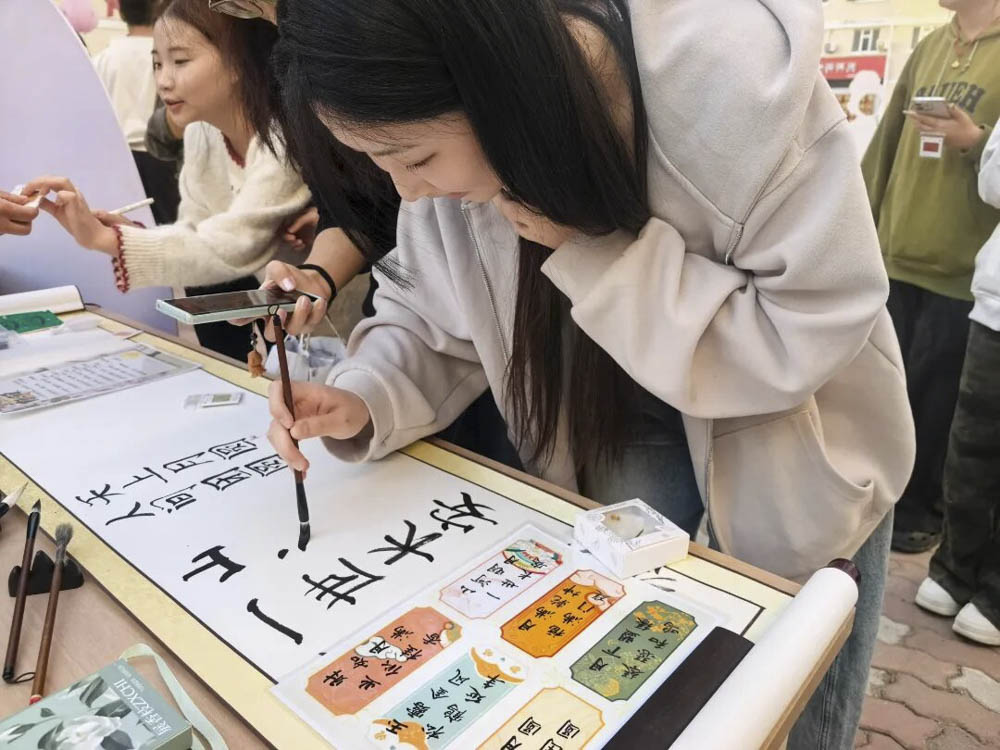 学生公寓外广场上,一场中秋户外雅集吸引了众多学子参与。活动现场设置了猜灯谜、长卷书法等传统文化体验区,学生们或驻足凝思,或挥毫泼墨,在笔墨纸砚间感受中华文化的独特魅力。同时,“月饼靶”丢沙包、套圈套萝卜等趣味游戏区域更是欢声不断。传统与现代交融的活动设计,为学子们打造了沉浸式的节日体验。校长助理魏可霏亲临活动现场,与同学们亲切交流,共度温馨佳节。