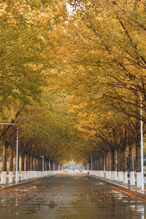 华德秋日里,一条林荫道被雨打湿,地面倒映着金黄与翠绿交织的树叶,两侧树木整齐排列,宛如为道路搭起的天然拱门,静谧又美好。