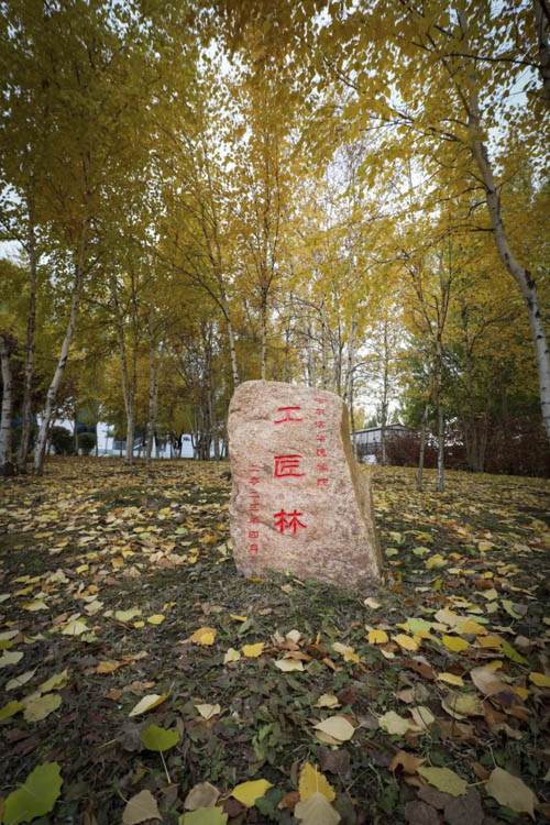 哈尔滨华德学院“工匠林”石碑矗立其间,金黄桦林与满地秋叶共舞,在秋意中凝萃匠心传承的人文诗意与自然之美。