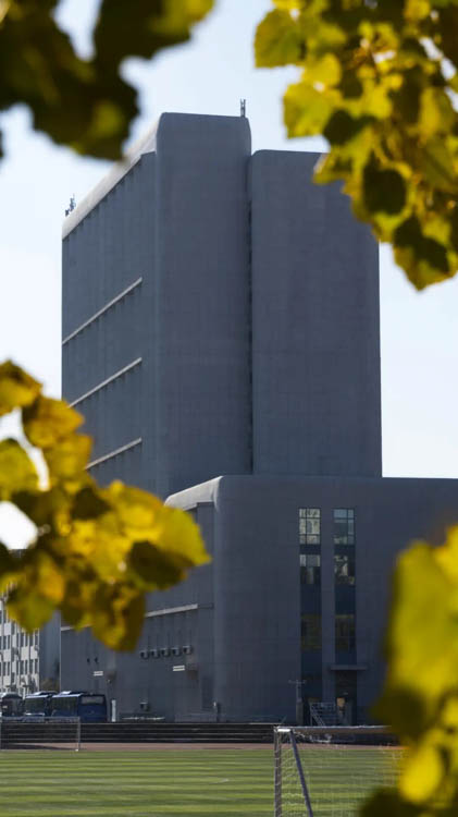透过金黄的秋叶框景,一座灰色的建筑矗立在秋日的晴空下。建筑的冷峻线条与秋叶的温暖色调形成鲜明对比,足球场的绿意点缀其间,秋的多元层次在此处尽显,仿佛是自然与建筑的一场秋日对话,框住了季节的独特韵味。