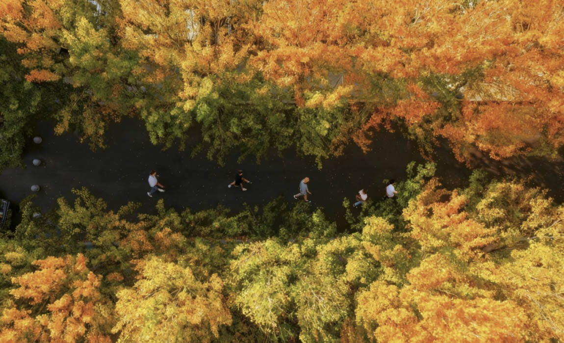 图中呈现的是学校里的创业路。俯视的视角,让我们成为时间的旁观者。学子的身影,是青春里一个沉默的标点,正缓缓嵌入这页金黄的诗行。步履所及,是知识的远方;落叶环绕,是年华的礼赞。此刻,仿佛能听见光阴与成长,在脚下沙沙作响。