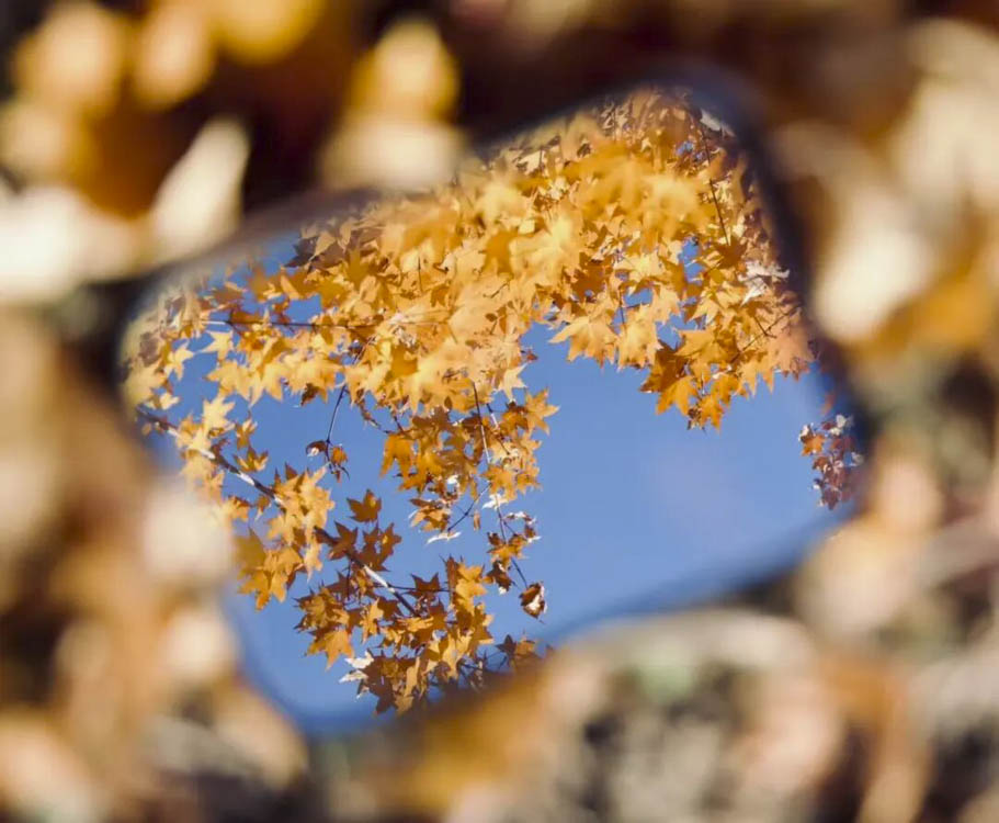 镜中蔚蓝的天与金黄的叶子构成温暖的秋日氛围,让人感受到秋日暖阳一般地温暖与唯美。