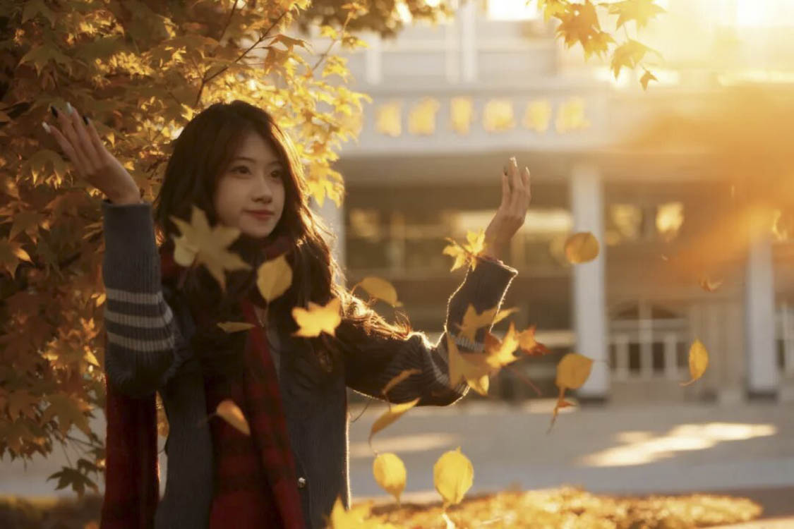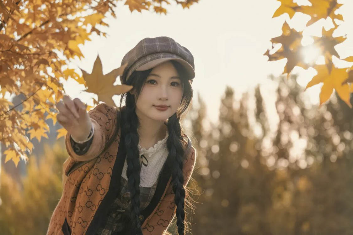 她站在金黄的枫树林间,格纹贝雷帽与双麻花辫衬着青春笑靥。橙棕外套裹着纤柔身姿,指尖轻托一片通透枫叶,似与秋阳共舞。风里浮动桂花香,落叶在脚下沙沙作响,她眼底的温柔晕染开秋色,将校园的诗意秋景,凝成一帧温暖的画。