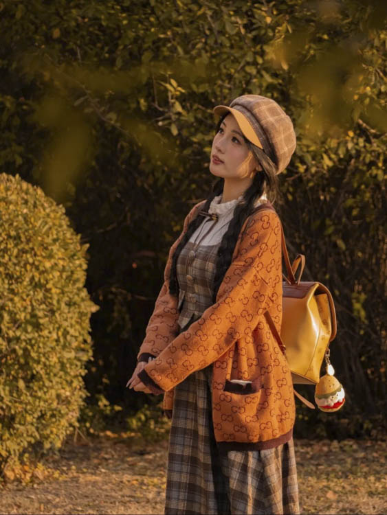 在秋林的诗意褶皱里,她以复古穿搭为笔,在暖黄光影的宣纸上,写就一段漫游的诗行。