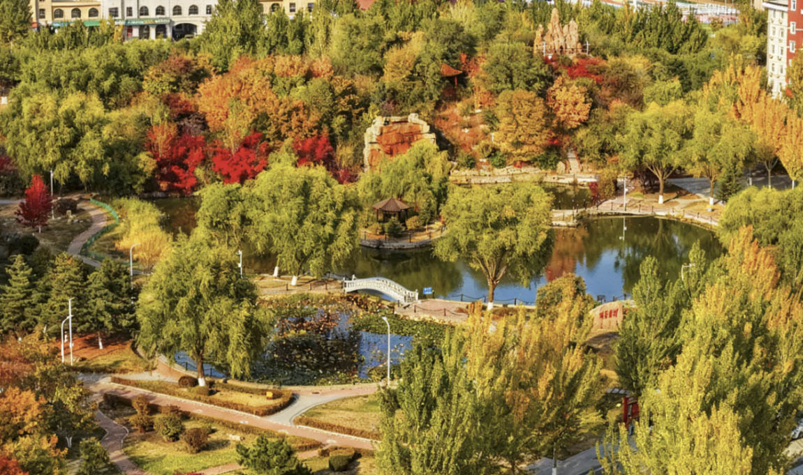 这张图呈现的是华德校园的秋日景致。画面中,学校的湖静谧悠然,湖上有小桥,湖中凉亭点缀。湖后是启峰山,山上树木色彩斑斓,红、黄、绿交织,与建筑相映,尽显校园秋韵。