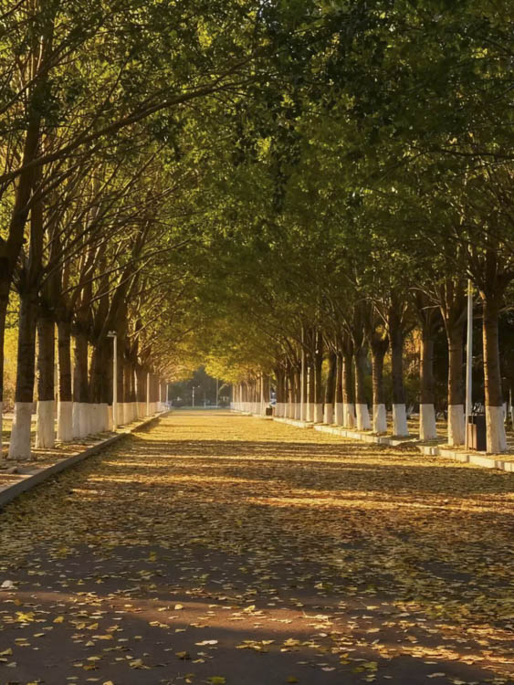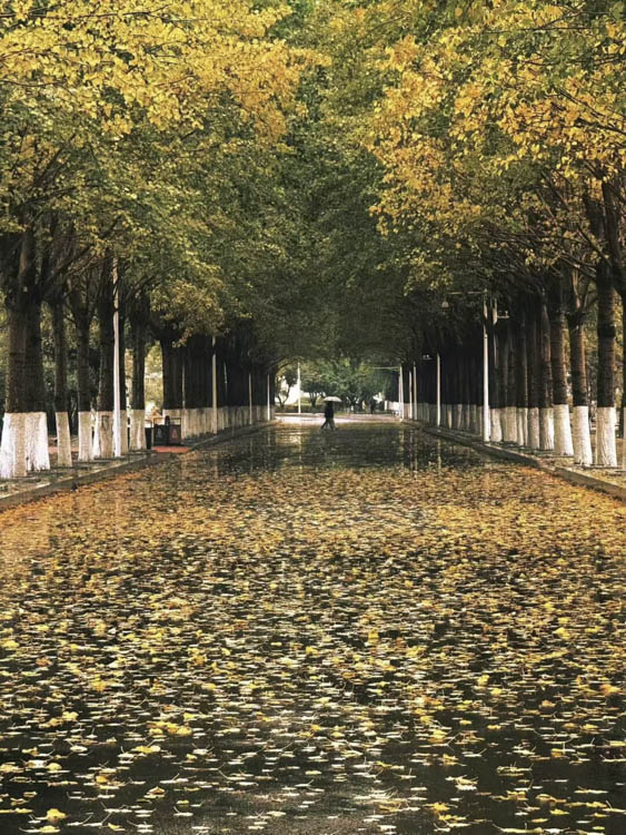 雨天的银杏道,落叶铺满湿润的路面,如金色织毯。行人撑伞漫步,两侧树木交织成天然拱廊,清冷的雨意与暖黄的叶色碰撞,勾勒出秋的诗意与孤寂,是校园里的秋日秘境。