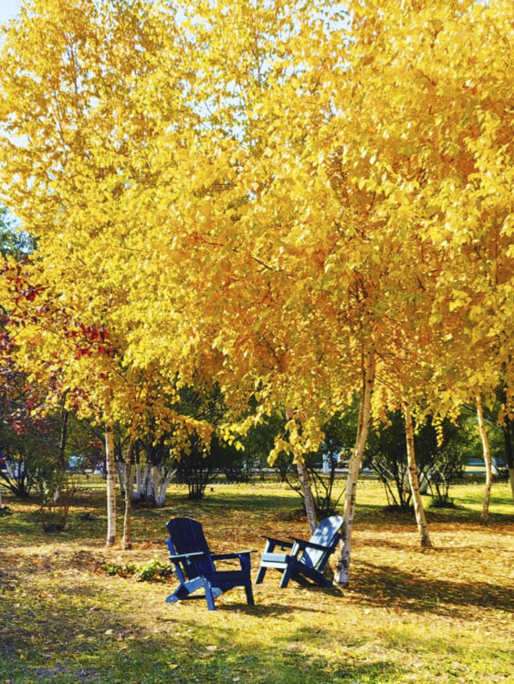 白桦裹满鎏金,秋阳筛碎光缕,铺就一地暖黄。两把靛蓝躺椅静卧林间,似在等风、等云,等一场不疾不徐的秋闲。叶簇叠成温柔的穹顶,将时光浸在澄澈的暖里,每缕光影都裹着季节的慵懒与明亮。