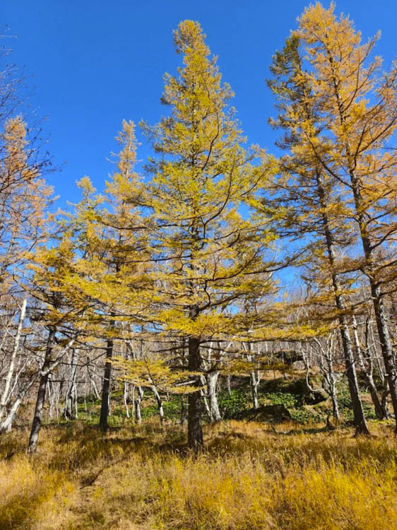 落叶松把金黄的梦植进蓝天,每一根枝桠都是时光的笔触,在山野间晕染出澄澈的秋意。那是秋将自己揉碎,洒在松针上的璀璨,是山林在季节的长卷里,写下的关于坚韧与绚烂的双重注脚。