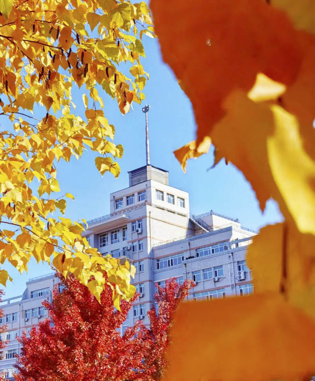 澄澈蓝天作底,金黄杨叶如蝶悬于檐角,炽烈红枫缀于楼前,将建筑晕染在秋的浓彩里。枝叶成框,框住校园楼宇的静穆与季节的鲜活,一帧秋光,裹满晴朗与温柔。