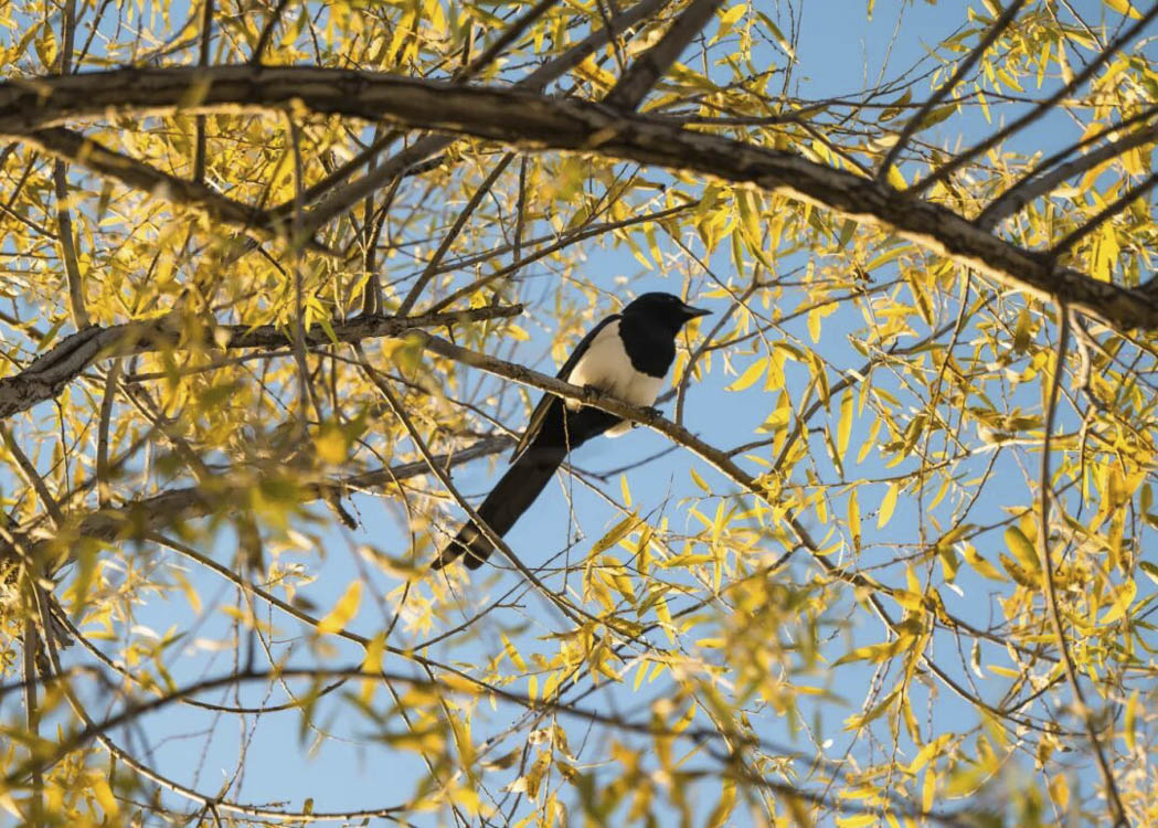 画面中喜鹊栖息于金黄的柳叶间,蓝天作衬。捕捉秋日里灵动的生命迹象,在秋柳的温婉中注入鸟儿的鲜活,展现秋景里生机与诗意的交融,传递出秋日并非寂寥,而是藏着灵动意趣。