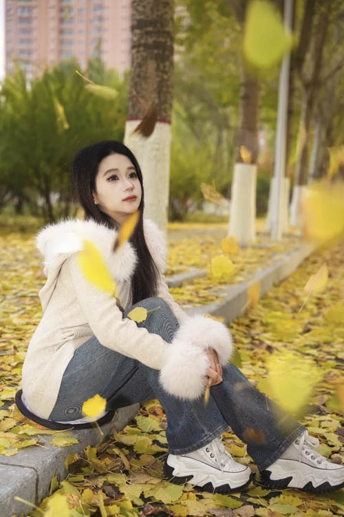 作品以秋日步行街为背景,金黄落叶与人物米白色毛绒装饰外套形成温暖色调呼应。通过不同姿态的呈现,捕捉秋日氛围感,展现季节之美与服饰风格的融合,传递出在秋意中静谧且惬意的情绪,定格属于这个季节的独特韵味。