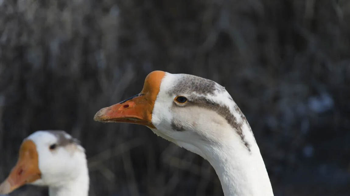 聚焦校园里问渠湖畔鹅的头部特写,橙喙与斑纹羽毛的细节生动鲜活,其专注的神态仿佛在洞察周遭,以动物视角传递自然中的生命张力,捕捉瞬间的灵动与专注。