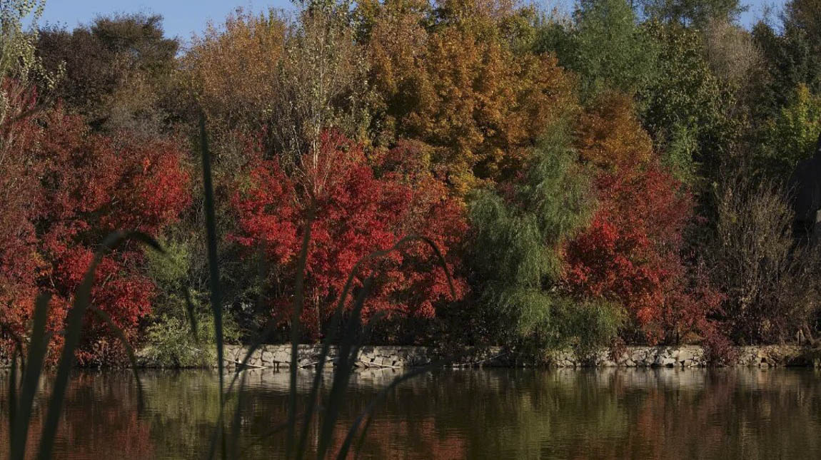 展现秋日湖畔的层林尽染之景,红、橙、绿交织的林木倒映在静谧湖面,芦苇点缀其间,将秋的绚烂与宁静相融,勾勒出季节交替时的色彩盛宴与自然之美。