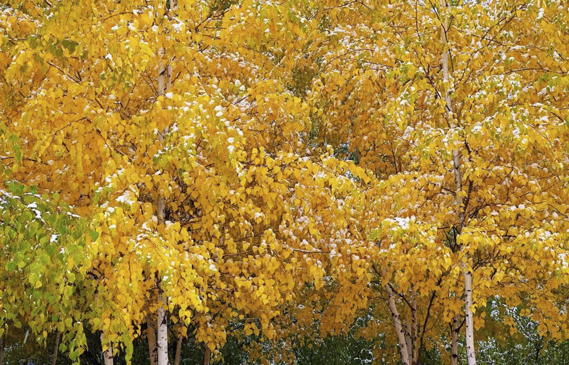 金黄的叶片如燃烧的火焰,在枝干间织就璀璨锦缎,而零星落雪似碎玉,轻覆于叶脉之上,将秋的热烈与初雪的清寒揉进同一帧画面。白桦树干亭亭而立,承载着季节交替时,生命在绚烂与素净间的温柔对话。