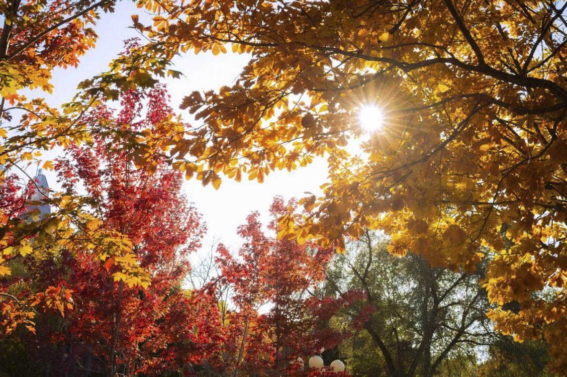 斑斓秋叶在阳光辉映下如鎏金般绚烂,红、橙、黄、绿交织成秋日织锦。阳光穿透枝叶的刹那,把秋的热烈与璀璨尽情铺展,意在描绘一场秋日里的绚烂色彩盛宴,彰显秋的蓬勃绚烂之美。