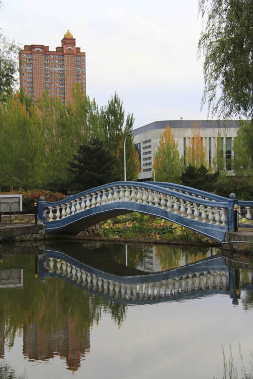 这是一座蓝白相间的拱桥,横跨静谧水面,桥影与建筑、树木倒影在水中交叠。周边秋意渐浓,树木色彩斑斓,背景营造出学校中一处雅致的亲水景观,静谧又富有诗意。