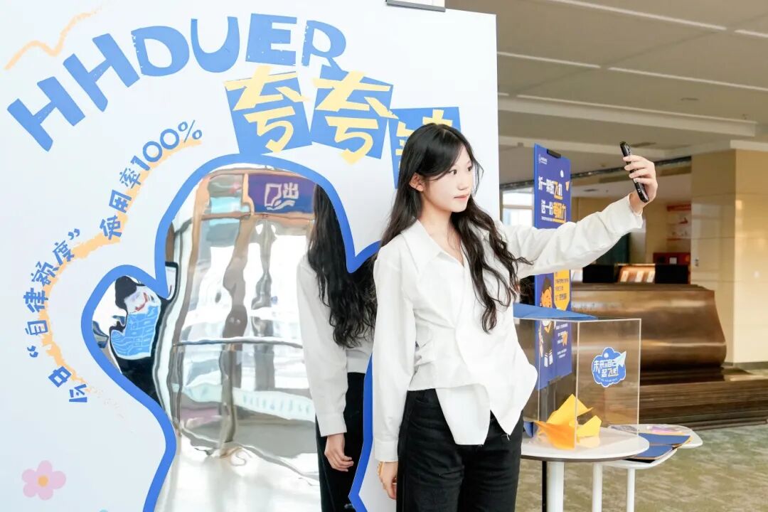 最受欢迎的角落,是那面“自我肯定夸夸镜”。镜面上写着“今日‘自律额度’使用率100%”“多么努力的HHDUER啊!”等话语。很多学生在这里驻足,整理衣襟,然后对着镜子里的自己笑一笑,举起手机。“不是单纯打卡,是真的需要这么一句肯定的暗示。”经济管理学院的周同学说。
