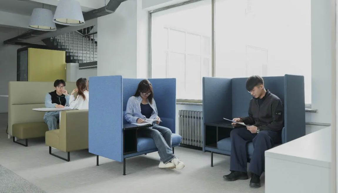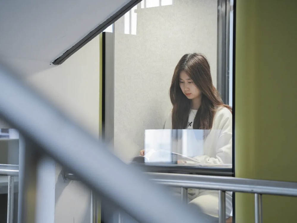 如果说充电插座回应的是“便捷”,那么每个楼层转角处设置的“静音亭”则回应了另一种需求——想一个人待一会儿。这个安静角落,隔绝了走廊的喧嚣,却隔不断窗外的阳光。有同学说,在这里戴上耳机,整个世界都安静了,十分钟也能回血。