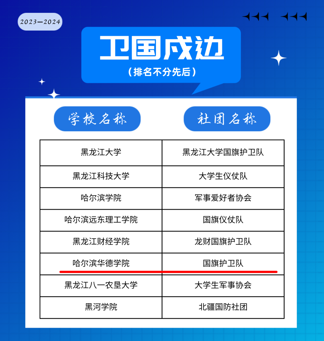 近日,团省委、黑龙江省学联积极开展“活力社团”评选活动,综合校内推选、活动展示页点赞、抖音视频展示情况,聚焦社团展示十大领域,结合各高校学生社团活动开展实际和事迹成果,经评选发布2023-2024学年黑龙江省高校“活力社团”TOP100榜,哈尔滨华德学院“新时代先锋”宣讲团、国旗护卫队成功入选黑龙江省高校“活力社团”TOP100!