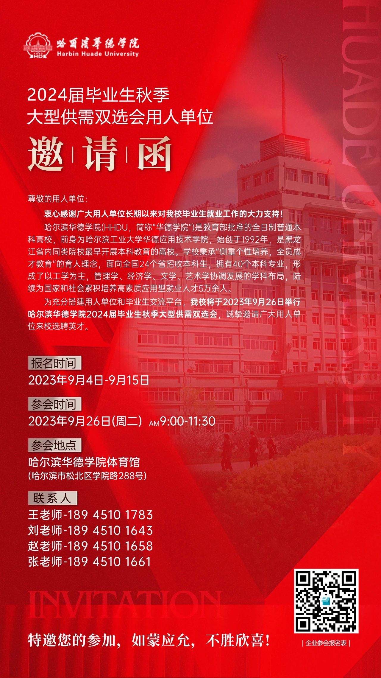 为充分搭建用人单位和毕业生交流平台,学校将于2023年9月26日举行哈尔滨华德学院2024届毕业生秋季大型供需双选会,诚挚邀请广大用人单位来校选聘英才。