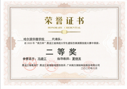 南方测绘集团独家冠名的首届2020“南方杯”黑龙江省高校大学生虚拟仿真测图技能大赛是国内测绘行业首次虚拟仿真线上竞赛,来自全省包括部分985、211本科院校、高职国家“双高”建设示范院校在内的31所学校的258名学生参加了比赛,规模较大。哈尔滨华德学院建筑与土木工程学院选派代表队积极参赛,荣获个人二等奖一项。