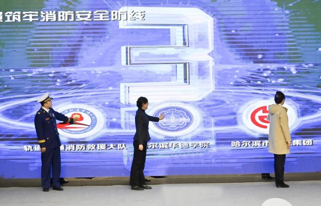 哈尔滨市消防救援支队副支队长李岩、哈尔滨市地铁集团副总经理范国荣、哈尔滨华德学院党委书记宋烨共同启动“4·17”消防安全宣传月。