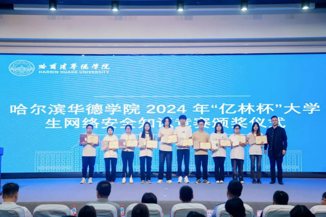为深入学习宣传 习近平总书记关于网络强国的重要思想、 国家网络安全有关法律法规和政策标准,贯彻落实培育“在校四有好网民”,增强在校学生网络安全意识,提高网络安全防护技能,在黑龙江省网络安全协会和黑龙江亿林网络股份有限公司指导和支持下, 哈尔滨华德学院于9月20日上午成功举办2024年“亿林杯”大学生网络安全知识竞赛颁奖典礼暨大学生网络安全技术讲座活动。