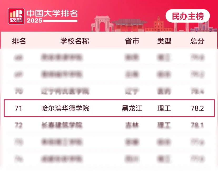 今日, 2025年 “软科中国大学排名” 正式发布,哈尔滨华德学院凭借卓越的办学实力和突出的人才培养成果, 在全国同类院校中位列第 71 名, 稳居全国百强, 省内同类理工院校第一名 。