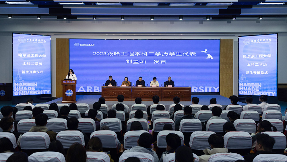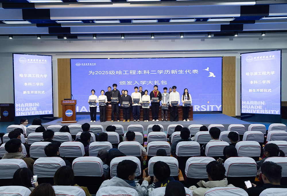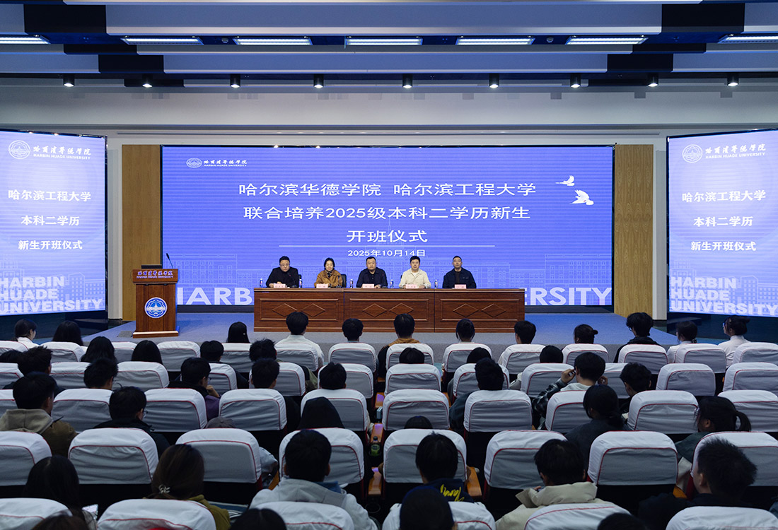 2025年10月14日, 哈尔滨华德学院联合哈尔滨工程大学举办的2025级本科二学历新生开班仪式在学校图书馆报告厅举行。 哈尔滨华德学院副校长李斌、哈尔滨工程大学继续教育学院自考办主任叶琳出席仪式并致辞, 哈尔滨华德学院继续教育学院副院长孙本龙主持仪式, 两校相关部门负责人、全体新生齐聚一堂,共同见证这一推动复合型人才培养、深化校际合作的重要时刻。