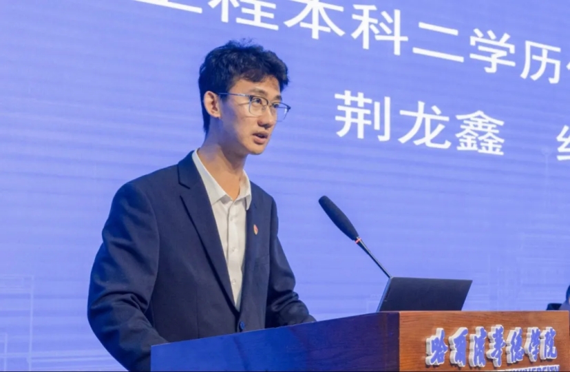 现任哈尔滨华德学院辅导员的优秀毕业生代表荆龙鑫分享了自己的成长轨迹。 在校期间,他通过二学历学习了工商管理知识,这一“跨界”学习为当前工作奠定了坚实基础。 “本科二学历为我的人生打开了‘另一扇门’,在工作中,工商管理专业所学的沟通技巧、组织管理、策划能力等,都让我能够更从容、更高效地开展工作,更好地为同学们服务,这正是二学历学习带来的独特优势。”荆龙鑫勉励新生:“学习的过程或许会辛苦,但当你拿着双证书站在 求职舞台上时,会感谢曾经坚持的自己。”