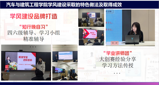 各学院结合专业特色积极实践:数据科学与信息工程学院推动竞赛普及与学习型寝室评选; 智能制造工程学院聚焦专业升级与竞赛生态建设; 汽车与建筑工程学院引入行业专家讲座,实施多对一学业帮扶;艺术与传媒学院以赛促学,拓展“专业+公益”实践模式;经济管理学院举办外语能力大赛并建立学习案例库,组建学风自律队开展日常督查。
