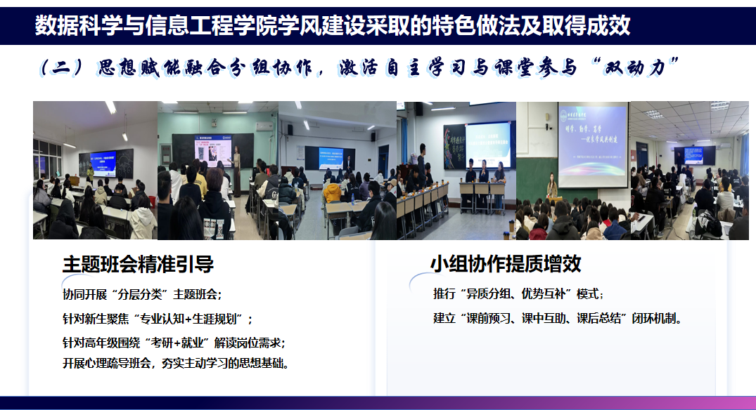 数据科学与信息工程学院开展优秀课堂笔记展示、特色晚自习、朋辈帮扶等活动,覆盖数千名学生,提升学习参与度与成效。汽车与建筑工程学院打造“知行晚自习+学业讲师团”品牌,通过学习小组、政策解读、竞赛经验分享等形式,营造“以优带学、互助共进”氛围。艺术与传媒学院实施“小组帮扶制”与“四六级攻坚”行动,开展分层辅导与特色活动,实现全员参与,学习效能显著提升。