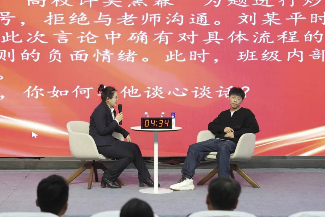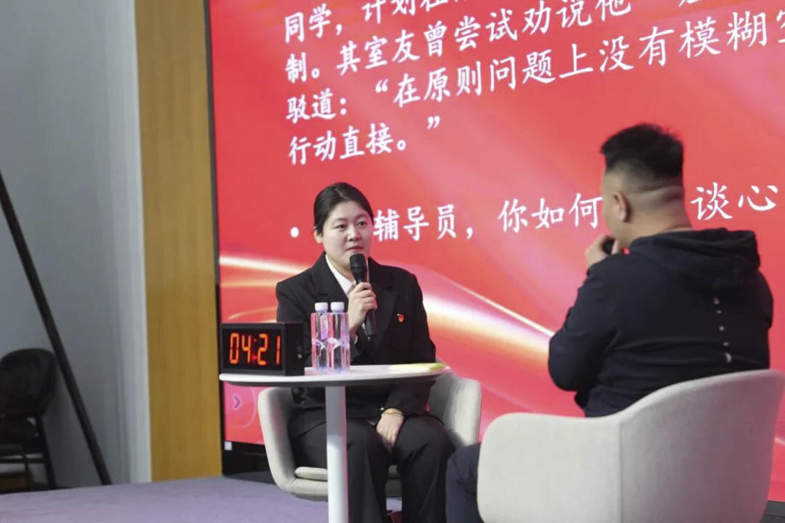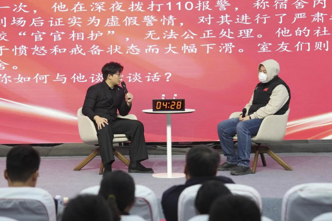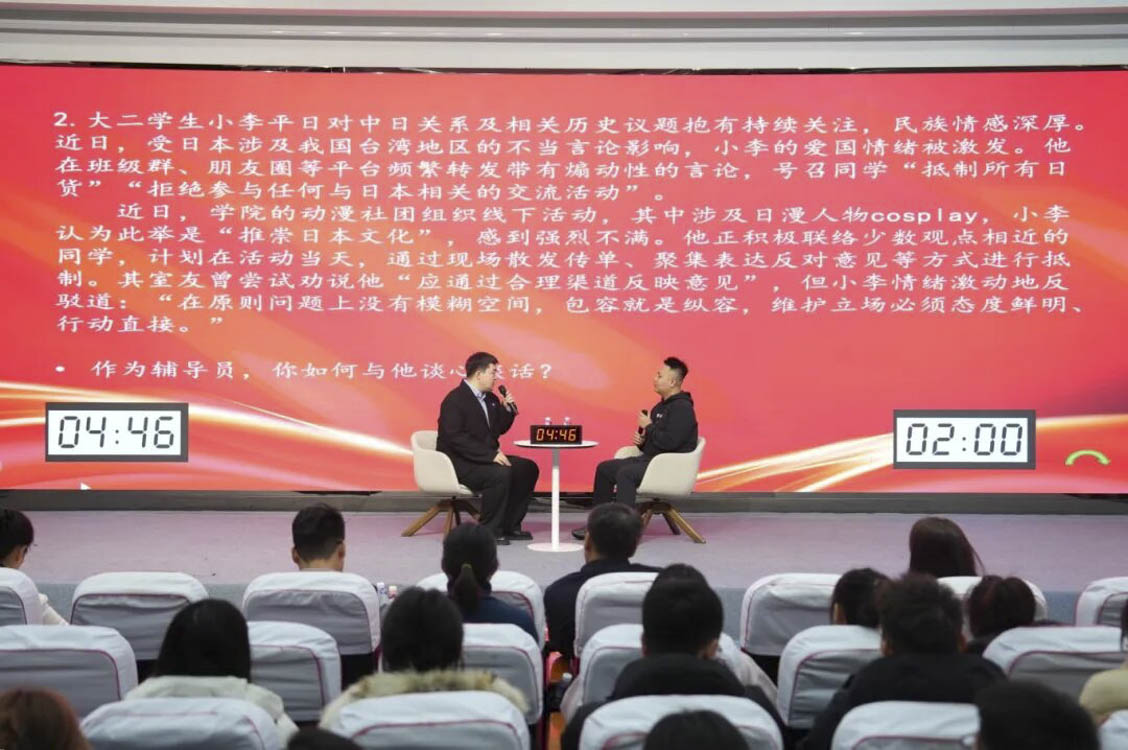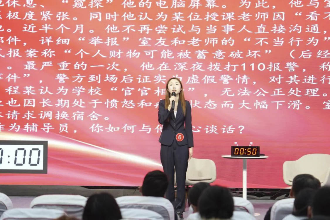 谈心谈话环节主要考察辅导员对学生特征、学生成长成才规律的了解把握程度,对学生的教育引导能力、解决理论困惑和实际问题的能力等。参赛选手随机抽取情景题目,限时与学生进行模拟谈心谈话,并于谈话后完成总结陈述,分析存在问题与改进措施。该环节集中考察并展现了辅导员在沟通引导、问题研判与解决策略等方面的专业素养,体现以学生为本的育人初心。