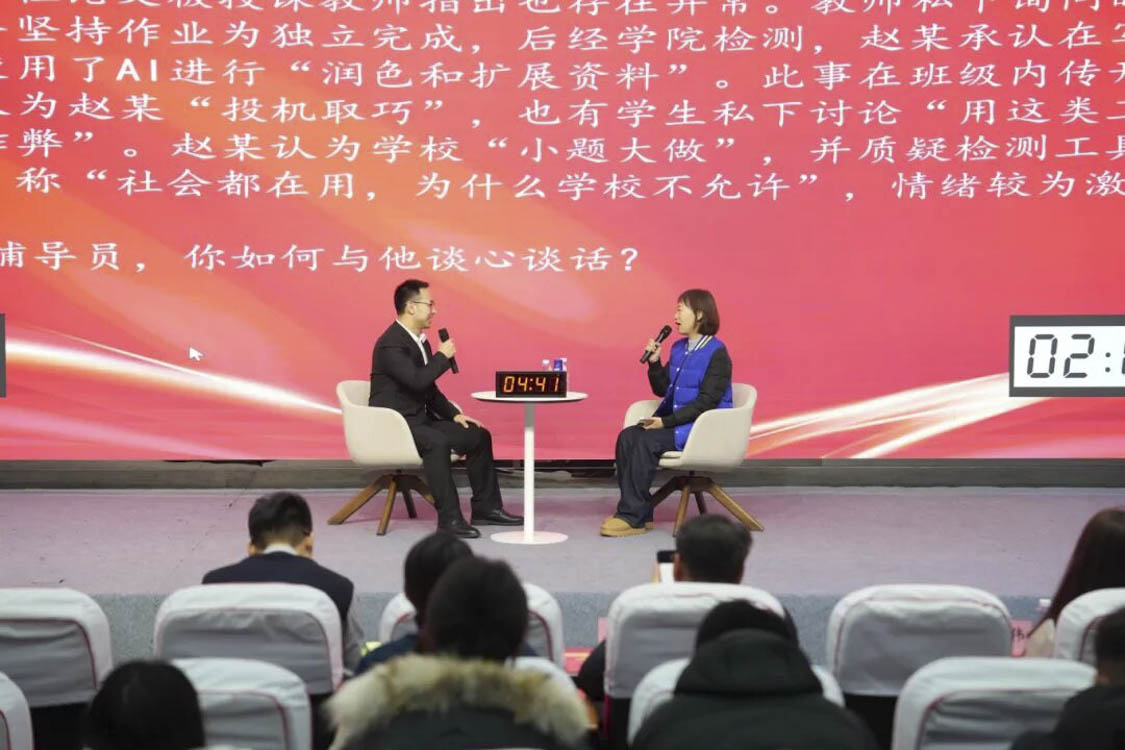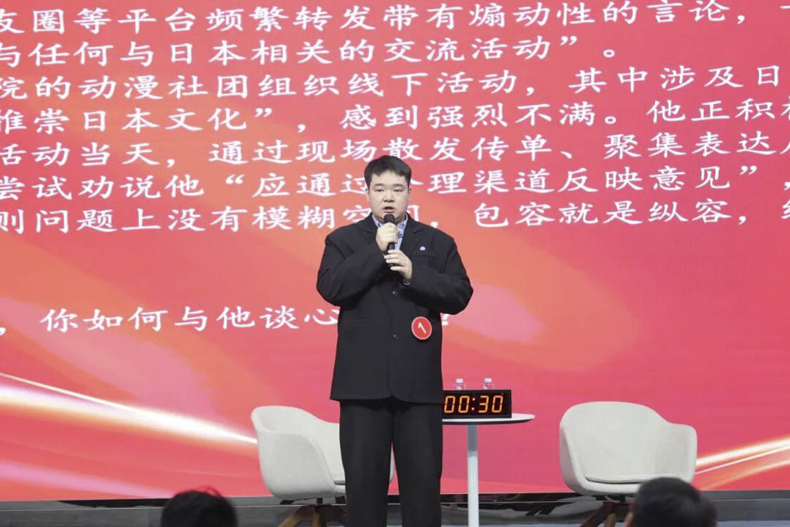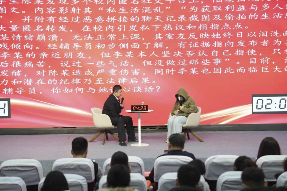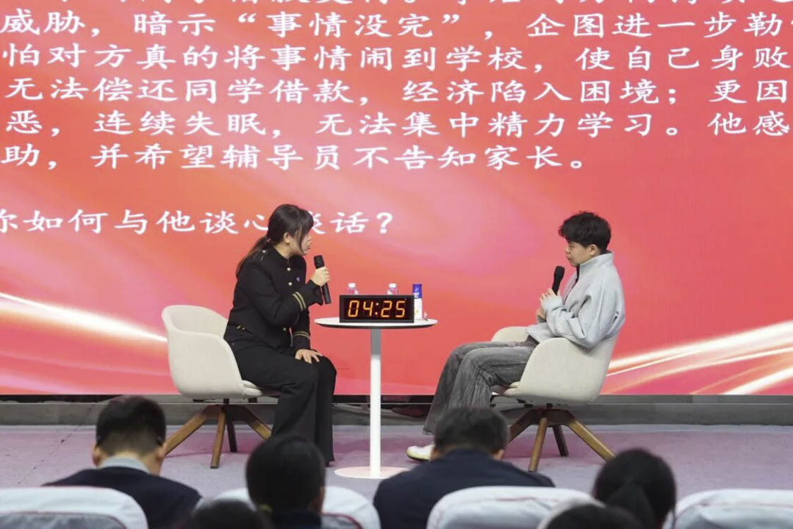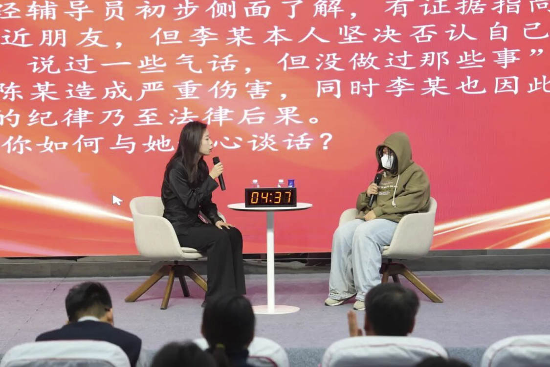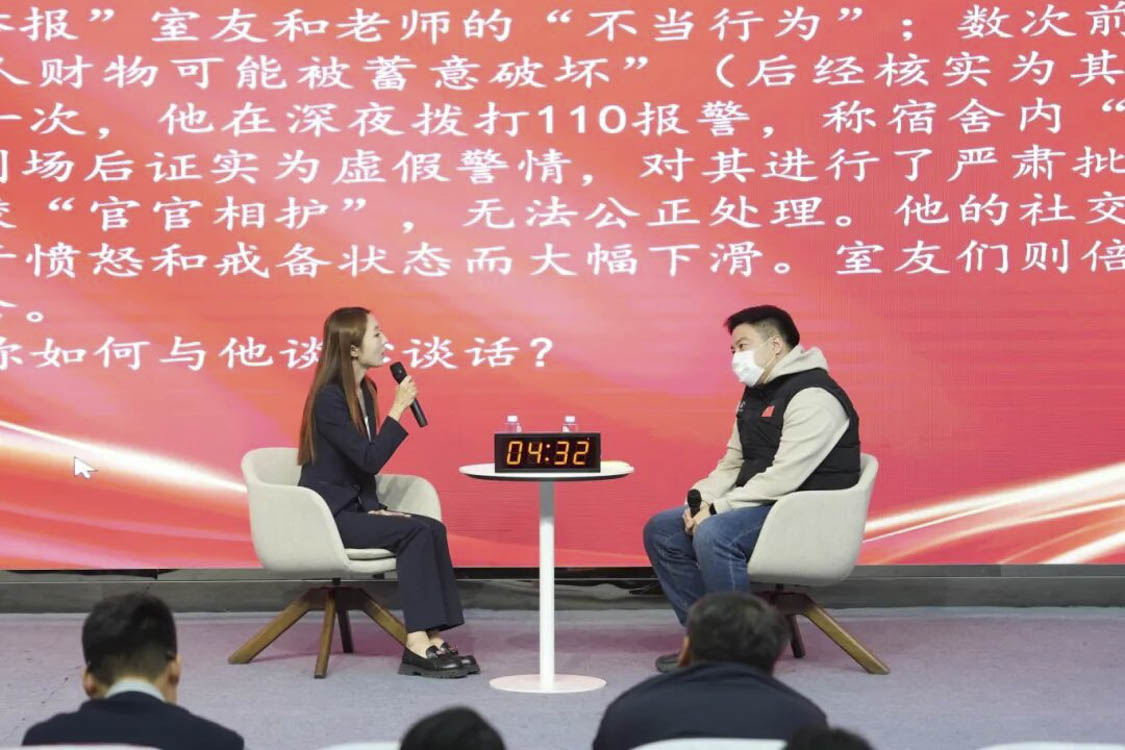 谈心谈话环节主要考察辅导员对学生特征、学生成长成才规律的了解把握程度,对学生的教育引导能力、解决理论困惑和实际问题的能力等。参赛选手随机抽取情景题目,限时与学生进行模拟谈心谈话,并于谈话后完成总结陈述,分析存在问题与改进措施。该环节集中考察并展现了辅导员在沟通引导、问题研判与解决策略等方面的专业素养,体现以学生为本的育人初心。