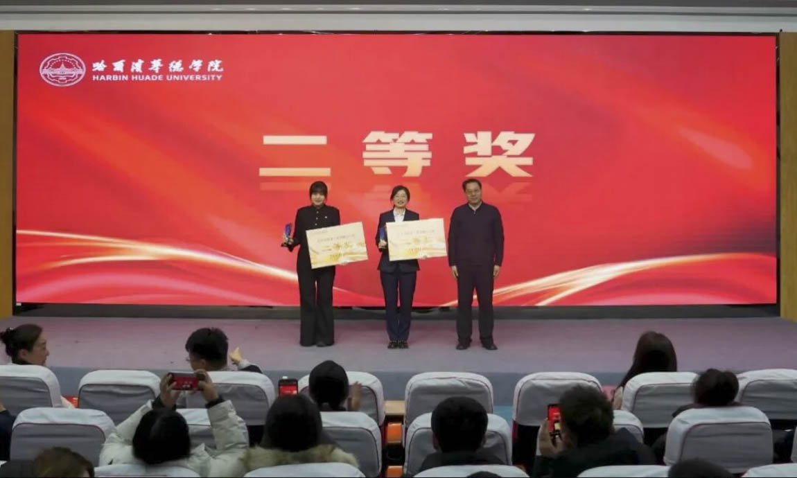 △ 哈尔滨华德学院学生处处长马旭远为优秀奖获奖选手数据科学与信息工程学院苏军、智能制造工程学院夏靖秋、艺术与传媒学院丛宇、数据科学与信息工程学院隋昕、汽车与建筑工程学院王奕达颁奖