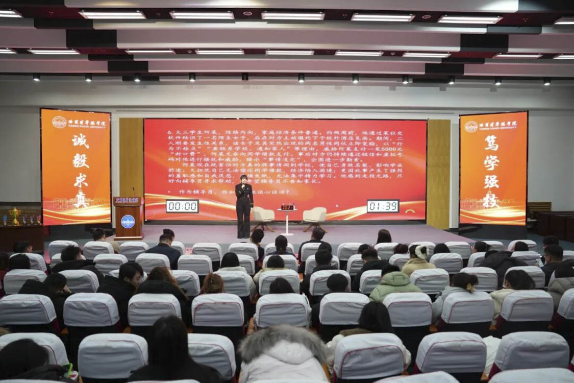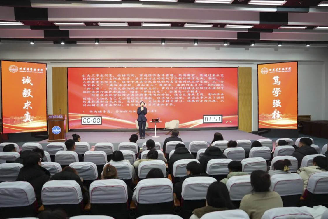 12月29日上午,共11名辅导员在图书馆学术报告厅进行谈心谈话环节,特邀哈尔滨师范大学刘国权、黑龙江中医药大学车志远、哈尔滨理工大学孟立伟担任评委。校长助理魏可霏、学生处处长马旭远、各学生发展中心主任及全体学生工作者现场观摩比赛。