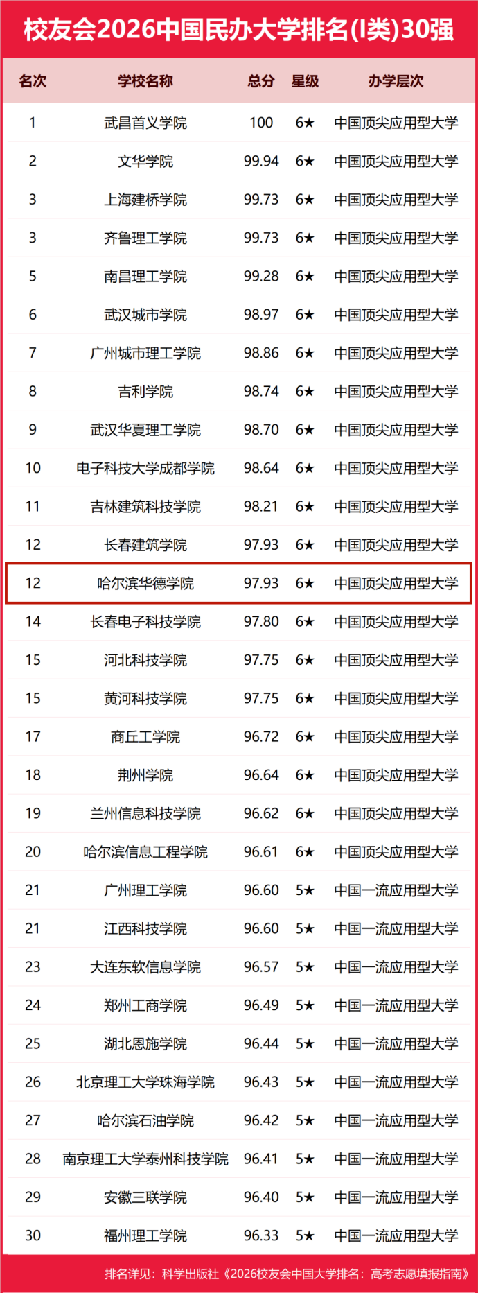 2026年1月12日,全国第三方大学评价研究机构艾瑞深校友会网(Cuaa.net)正式发布校友会2026中国大学排名。 哈尔滨华德学院凭借卓越的办学实力和影响力,以总分97.93的优异成绩,荣登2026校友会排名第12名,获评中国顶尖应用型大学(6 星 ),省内同类院校工科类排名第一。 在本次排名中,学校不仅较上一年度跃升一名,更实现了 连续六年稳居“校友会中国民办大学排名20强(I类)” 的里程碑式成就。这一喜人成绩,标志着学校综合办学实力再上新台阶!
