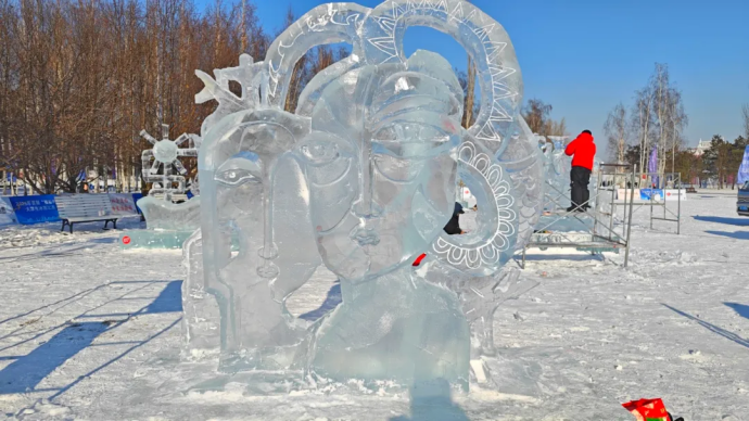 团队创作的《凝眸・共生》以立体主义风格为核心,塑造出双生面容的艺术形象,尽显匠心巧思。作品采用冰体镂空与曲面切割相结合的技法,借助冰材本身的澄澈质感,让两张面容在光影流转中相互叠映,对视的姿态巧妙织就情感联结,传递出人与人、人与自然间相依相伴的共生理念。创作团队更以冰的易逝性为隐喻,诠释关系的脆弱与珍贵,极简风格的底座设计则让视觉焦点完全集中于双生面容的呼吸感,在冰雪的冷冽质感中藏入柔软的情感内核,实现了艺术美感与思想深度的双重表达。